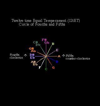 In twelve note equal temperament, as the octave is divided into twelve equal intervals, it is possible to construct a circle of twelve notes in intervals of fourths of (500 cents) in a clockwise direction and of fifths (700 cents) in the opposite direction. Moving twelve steps in either direction will arrive back at the starting note in the next octave. Twelve equal intervals like hour posoitions on a clockface.